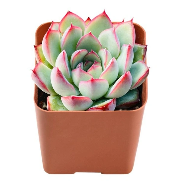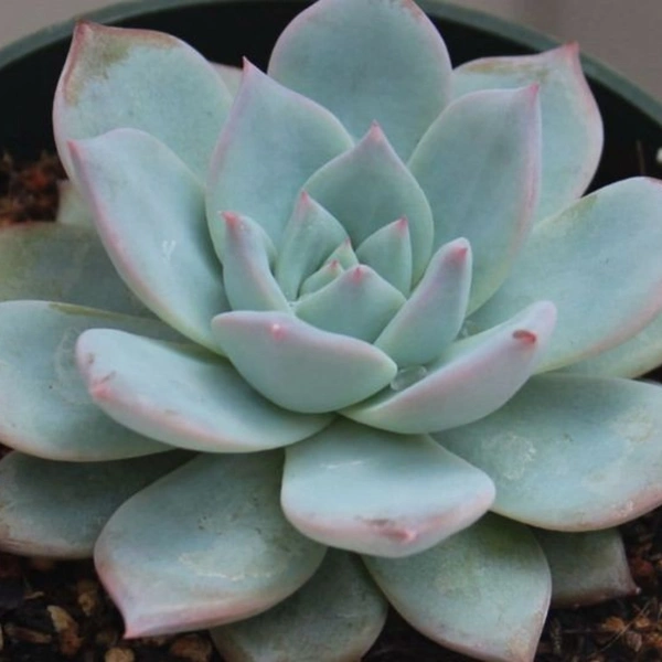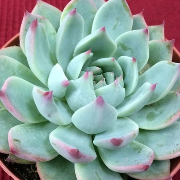 In bright light Echeveria forms small rosettes with fleshy, glaucous light silvery blue leaves with pink tips. It quickly offsets to form clusters. In summer it blooms with short arching racemes of flowers.